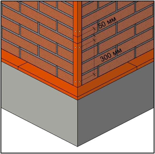 8.2.4 В случае отделки внешних углов при помощи металлических уголков с посыпкой их следует монтировать снизу-вверх с нахлёстом 50 мм. Для ускорения процесса монтажа, рекомендуется заранее подготовить отверстия в планке под крепёж с шагом между отверстиями в 300 мм.